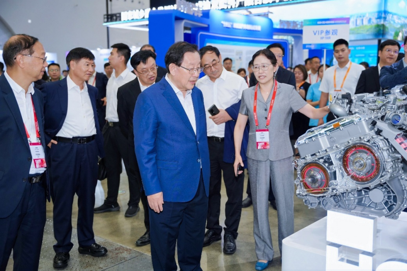 极光湾科技CEO王瑞平为中国科协主席、世界新能源汽车大会主席万钢,全国政协经济委员会副主任苗圩等一行领导讲解浩思动力最新科技成果